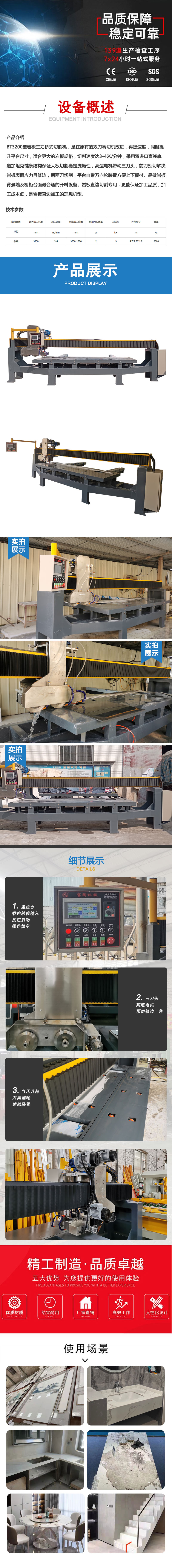 BT3200型巖板三刀橋式切割機(jī),主要用于直邊開料切割,具有單任務(wù)或多任務(wù)的設(shè)置,可實(shí)現(xiàn)自動回刀多任務(wù)切割。省時(shí)省力,是大板巖板加工利器,可達(dá)3-4米/分鐘,采用雙進(jìn)口直線軌道加坦克鏈條結(jié)構(gòu)保證大板切割穩(wěn)定流暢性,高速電機(jī)帶動三刀頭,前刀預(yù)切解決巖板表面應(yīng)力且修邊,后兩刀切割,平臺自帶萬向輪裝置方便上下板材。是做巖板背景墻及櫥柜臺面最合適的開料設(shè)備。巖板直邊切割專用,更能保證加工品質(zhì),加工成本低,是巖板直邊加工的理想機(jī)型。
