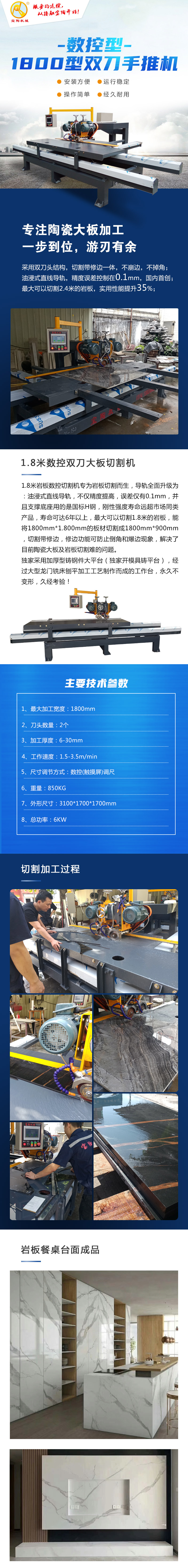 1800型數(shù)控雙刀手推式切割機(jī)最大加工尺寸1800mm,將1800mm*900mm的陶瓷大板、巖板切割成900mm*900mm,采用前后2個刀頭加工的方式,切割帶修邊功能,能有效避免切割后出現(xiàn)崩邊等情況,這種機(jī)械操作簡單,加工精度高,切割不崩邊,是加工陶瓷大板、巖板非常理想的一款機(jī)械。