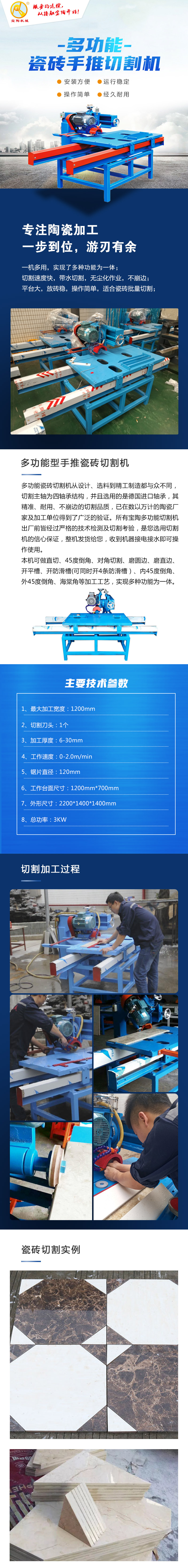 1200型多功能瓷磚切割機(jī)整機(jī)國標(biāo)鋼材打造,剛性更好,更耐用,工業(yè)級(jí)別的3KW電機(jī),動(dòng)力更加強(qiáng)勁,采用品牌原裝電機(jī)(全銅線),使用壽命更長,超大的切割能力。最大能切1200mm長的瓷磚,可做直切、45度倒角、對(duì)角切割、磨圓邊、磨直邊、開平槽、開防滑槽(可同時(shí)開4條防滑槽)、內(nèi)45度倒角、外45度倒角、海棠角等加工工藝,實(shí)現(xiàn)了多種功能為一體??梢约庸翘萏げ?、梯級(jí)磚、地腳線等。
